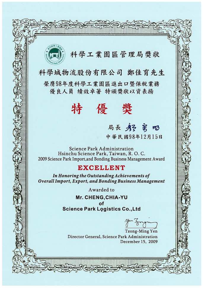 本公司謝俊敏主任/鄭佳育主任榮獲98年度科學工業園區進出口暨保稅業務優良人員。