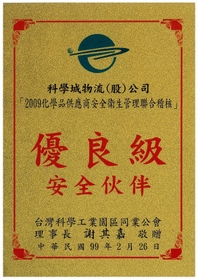 本公司榮獲科學園區同業公會頒發 [ 2009化學品供應商安全衛生管理聯合稽核「優良級」安全伙伴 ]