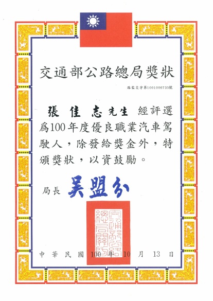 本公司張佳志榮獲交通部公路總局100年度優良職業汽車駕駛人