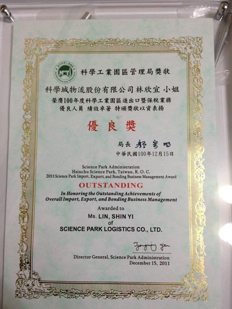 本公司林欣宜榮獲100年度新竹科學工業園區進出口暨保稅業務優良人員