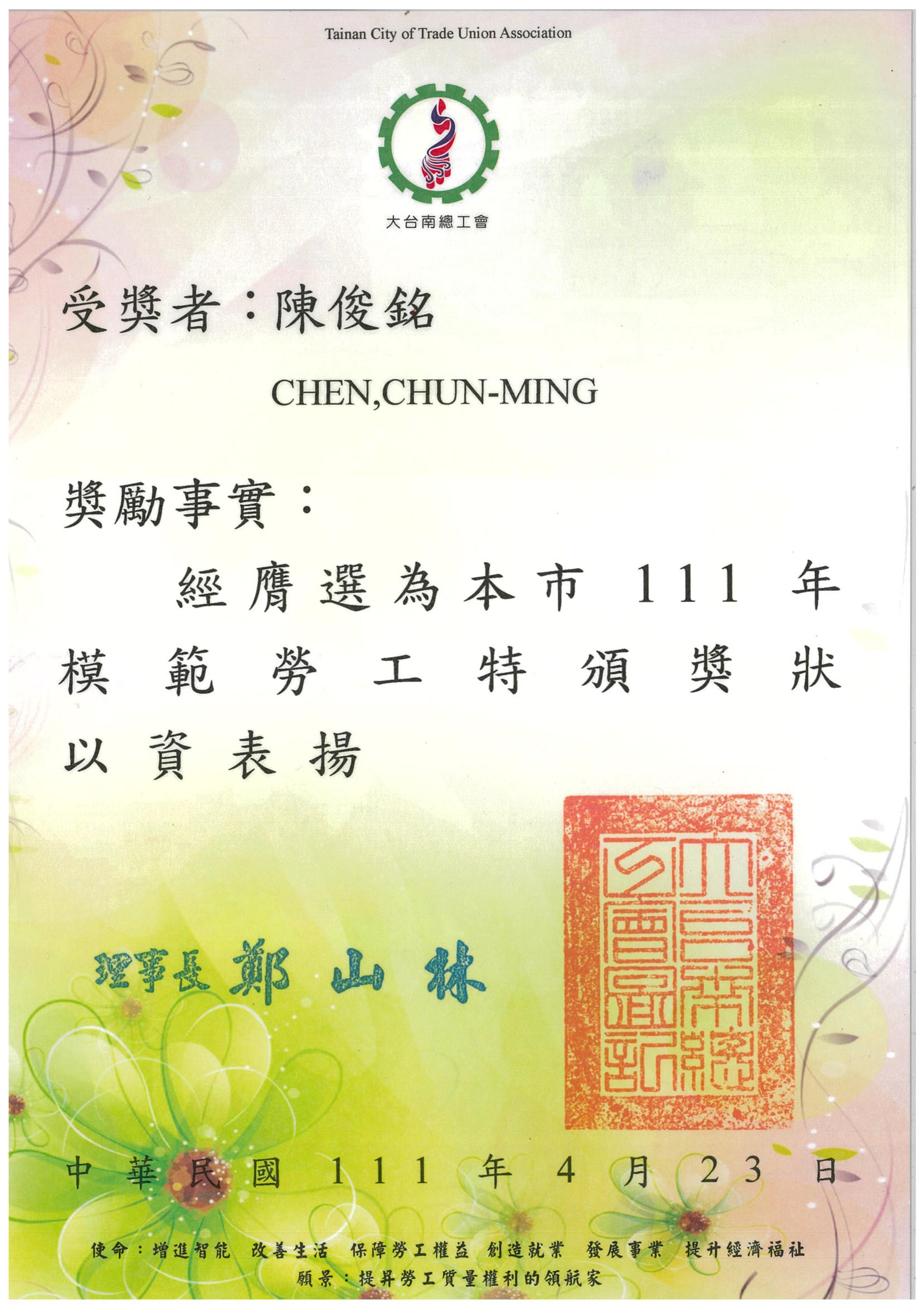 本公司陳俊銘榮獲大台南總工會111年度模範勞工