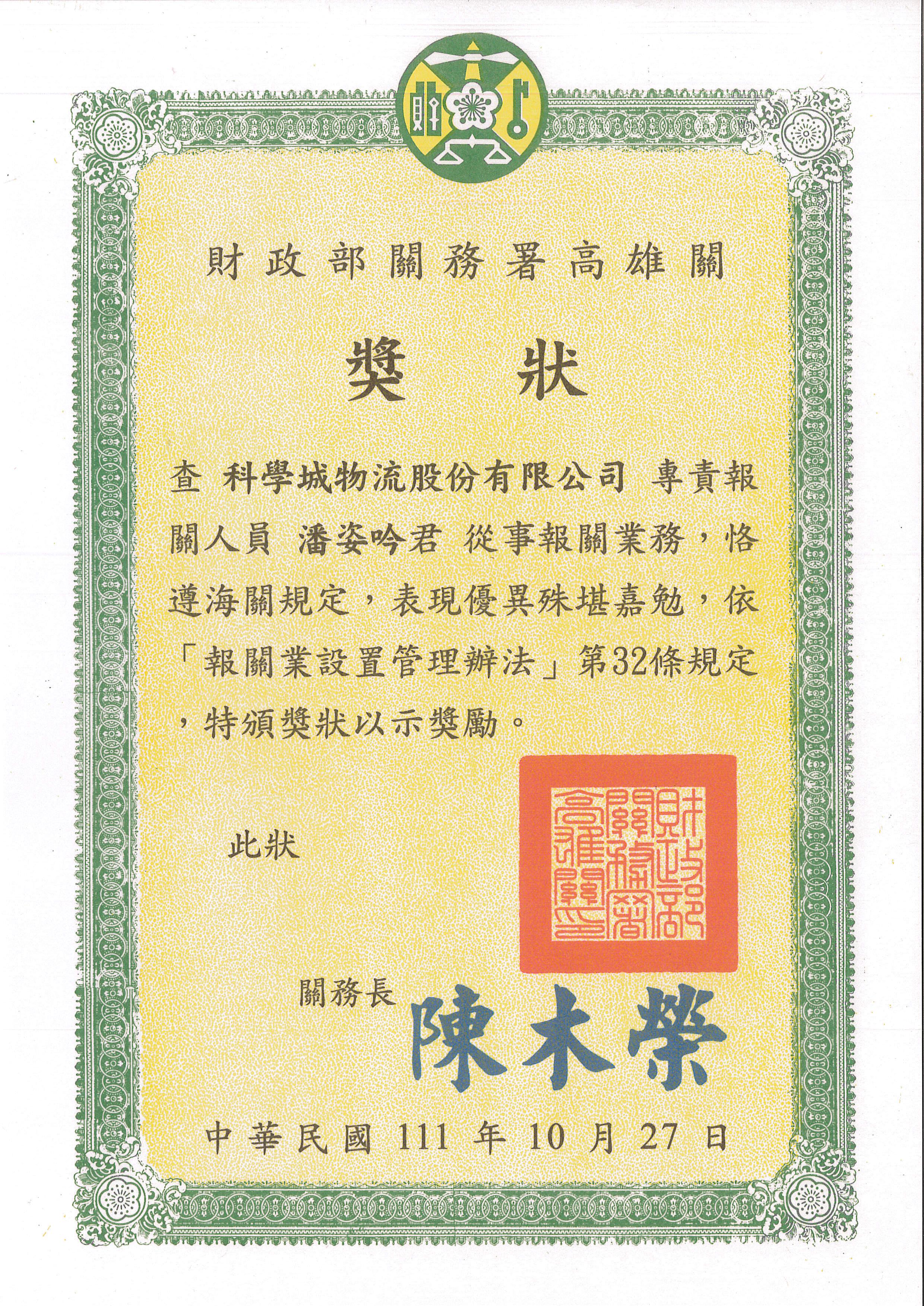 本公司潘姿吟榮獲財政部關務署高雄關111年度優良專責報關人員