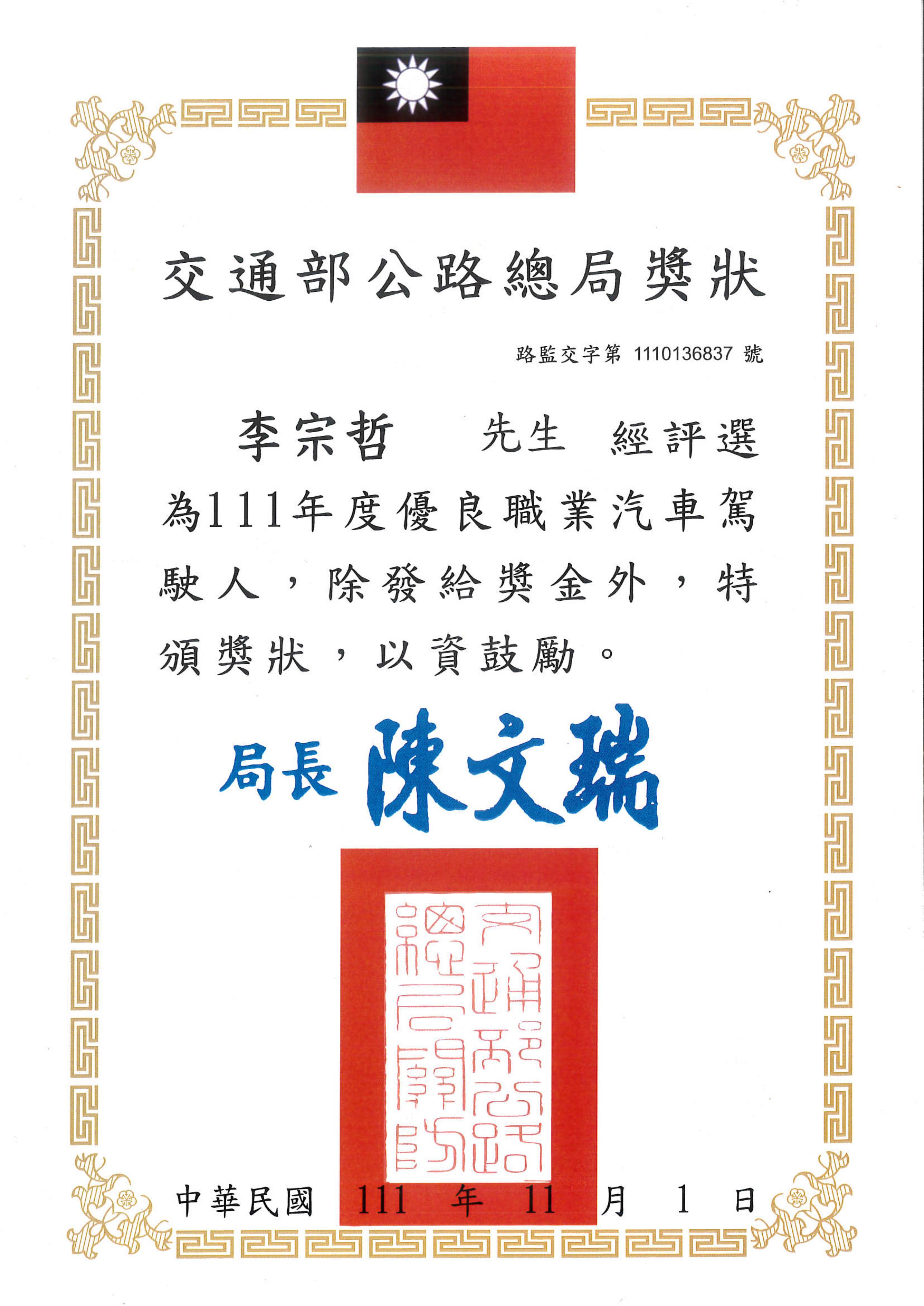 本公司李宗哲榮獲交通部公路總局111年度優良職業汽車駕駛人