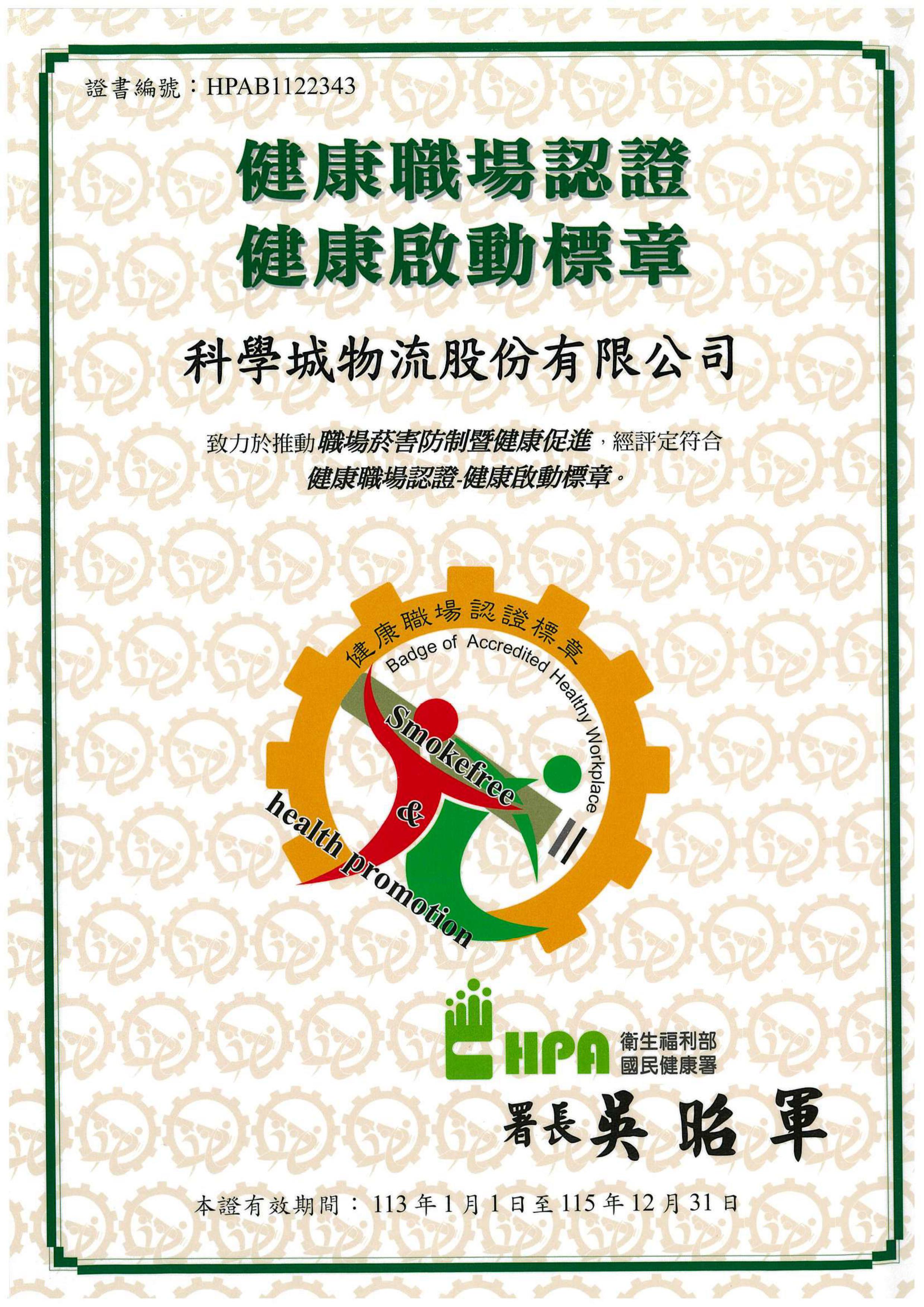 科學城物流竹科分公司榮獲健康職場認證-健康啟動標章