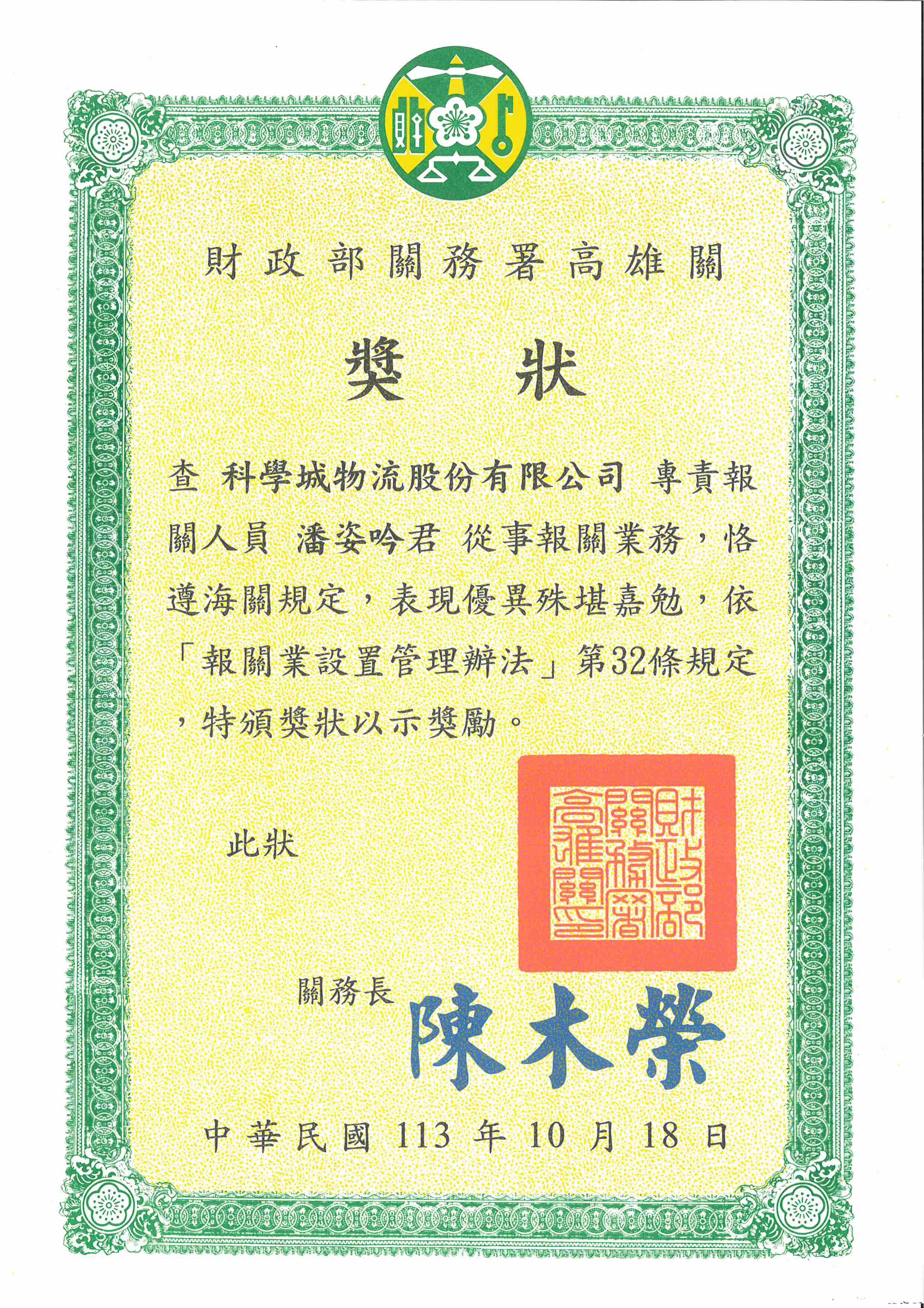 本公司潘姿吟榮獲財政部關務署高雄關113年度績優報關專責人員。