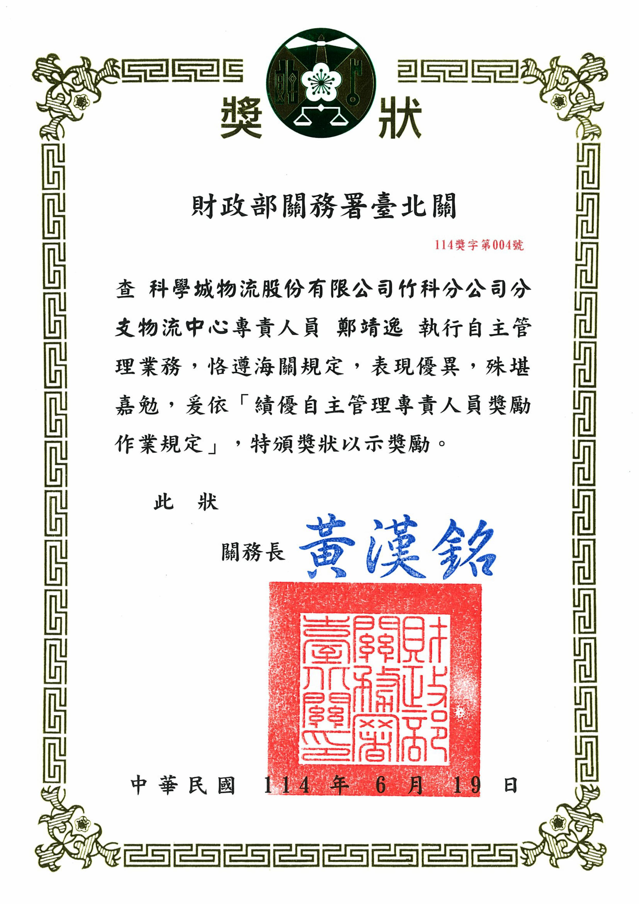 本公司鄭靖逸榮獲財政部關務署臺北關114年度績優自主管理專責人員。