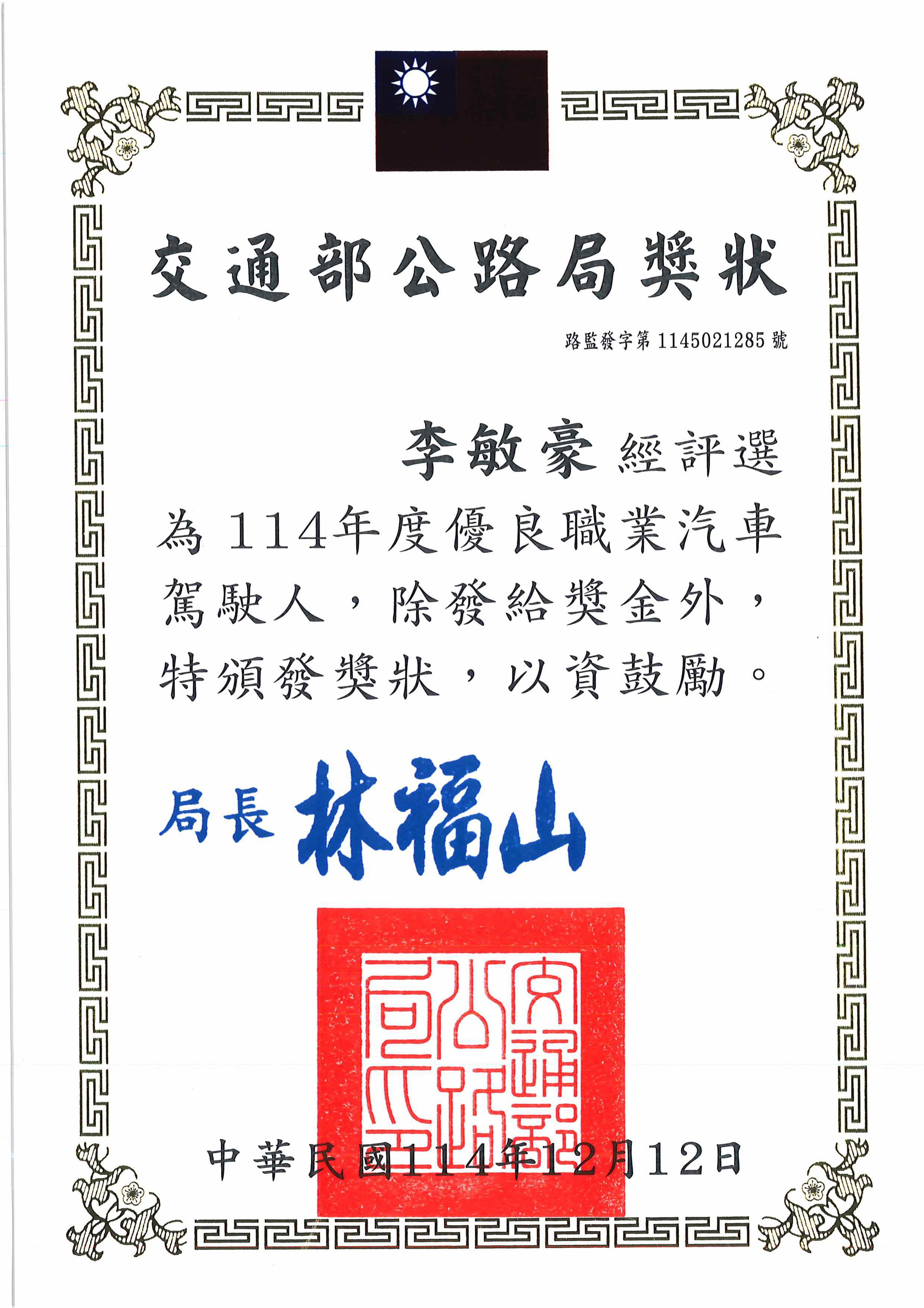 本公司李敏豪榮獲交通部公路局114年度優良職業汽車駕駛人
